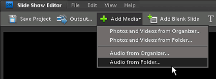 In Slide Show Editor, select Add Media as shown above to add your sound track. You can trim the audio to fit the movie.